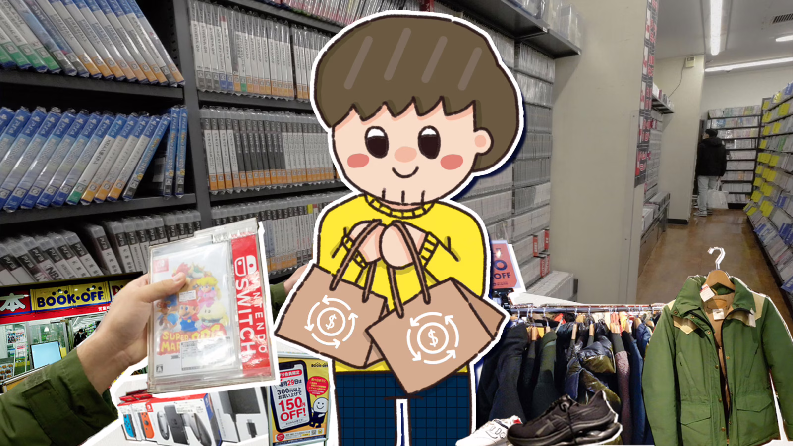 ที่ประเทศญี่ปุ่นมีร้านขายสินค้ามือสองเยอะมาก เรียกว่าเดินไปย่านไหนต้องเจอร้านแบบนี้อย่างน้อยสักหนึ่งร้าน ร้านขายสินค้ามือสองที่ดัง ๆ ของญี่ปุ่นก็เช่น Bookoff, 2nd Street หรือ Bingo โดยสินค้าที่วางขายในร้านเหล่านี้มีความหลากหลาย ไม่ว่าจะเป็น เสื้อผ้า, เครื่องประดับ, เครื่องใช้ไฟฟ้า, เครื่องเล่นเกม, ของเล่น, ของสะสม, หนังสือ หรือแม้กระทั่งเฟอร์นิเจอร์ โดยสินค้าที่วางขายในร้านเป็นสินค้าสภาพดีที่คัดมาแล้ว สินค้าบางตัวยังอยู่ในซีล ไม่เคยแกะออกมาใช้เลยก็มี